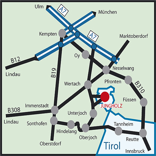 Über die BAB A7 bis zur Anschlußstelle 137 Oy-Mittelberg,dann weiter auf der B 310 Richtung Oberjoch.3 km nach Wertach Richtung Jungholz abbiegen.Wir wünschen Ihnen eine gute Fahrt.Ihr Team von der Schrofen-Hütte.